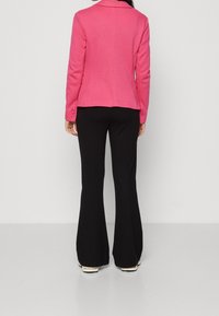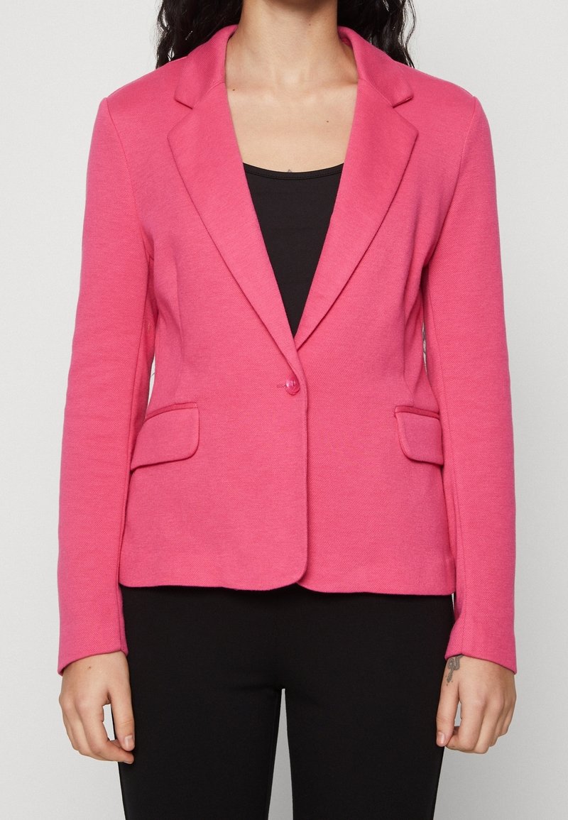 Blazer rose cintré avec un revers cranté, des poches avant et une fermeture à un bouton. Le tissu présente une texture lisse.