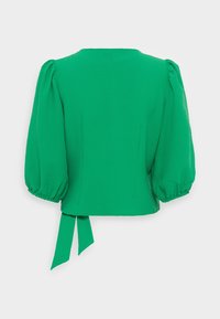 Blouse verte vif à style portefeuille avec manches trois-quarts bouffantes et nœud en tissu à la taille.