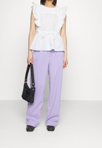 Blouse blanche avec manches à volants, panneau avant texturé et taille avec cordon de serrage. Portée avec un pantalon violet clair. Tissu doux et léger.