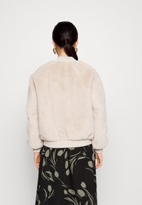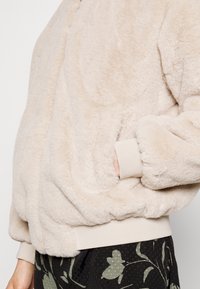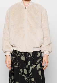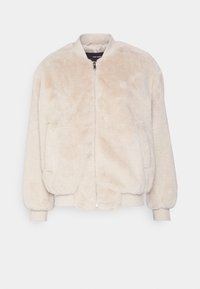 Veste bomber en fausse fourrure beige clair, dotée d'une fermeture éclair à l'avant, de poignets et d'un ourlet côtelés, avec une coupe décontractée et une texture douce.
