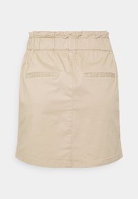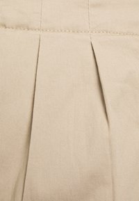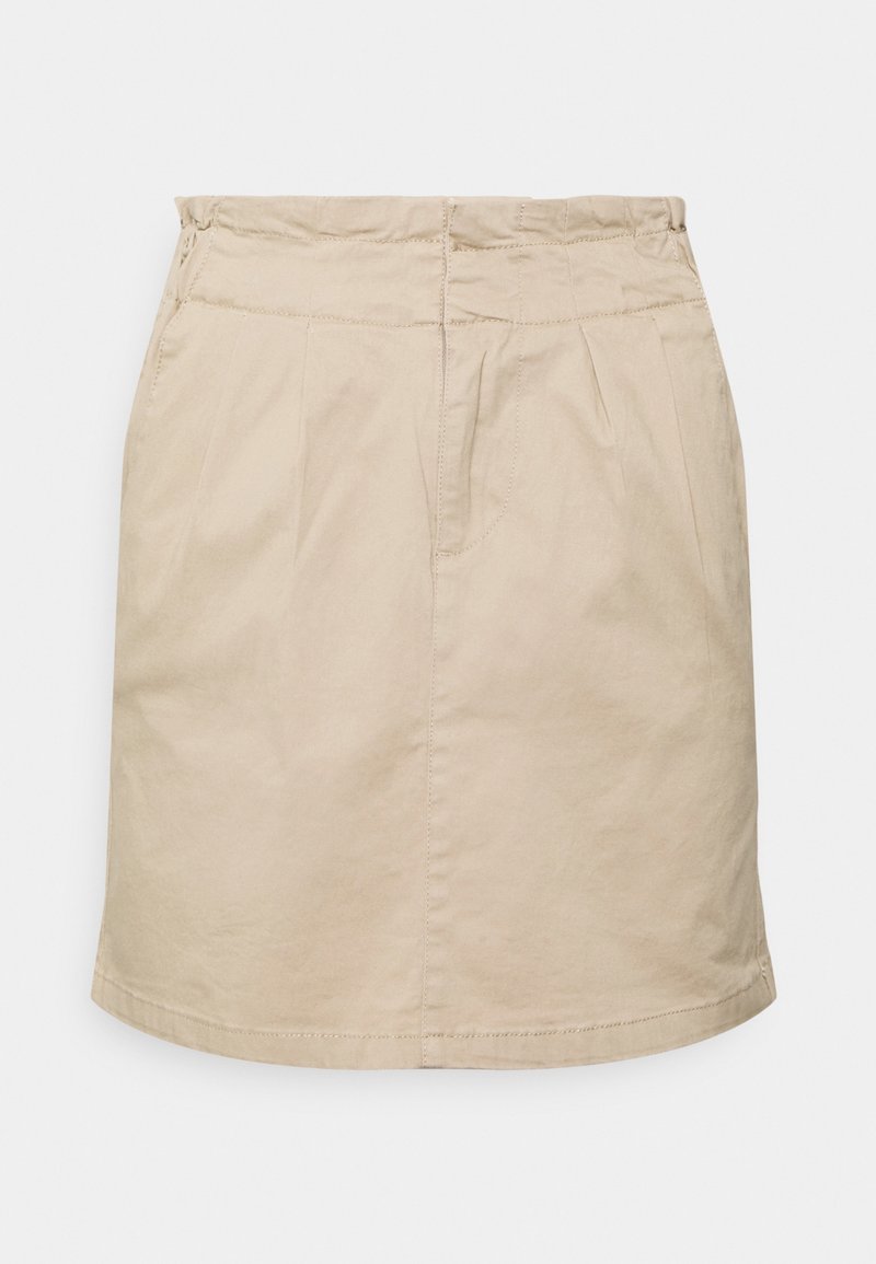 Jupe en coton beige de coupe droite, avec des plis à l'avant et une taille plate. Ourlet simple sans accents ni motifs supplémentaires.