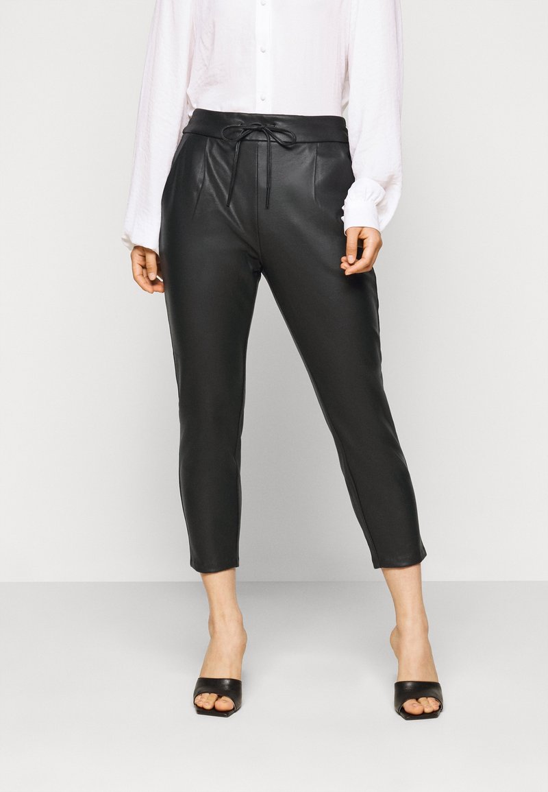 Pantalon noir en simili cuir avec une coupe fuselée, taille à cordon et plis à l'avant. Associé à une chemise blanche boutonnée et des sandales slides noires.