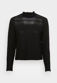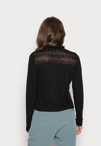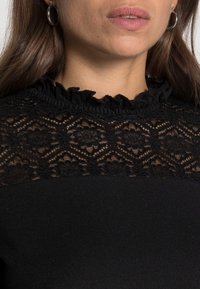Femme portant un haut noir à manches longues avec des détails en dentelle au niveau du décolleté et un pantalon bleu clair, les mains dans les poches.