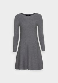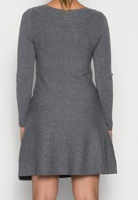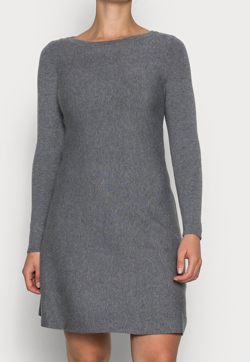 Robe en tricot gris avec des manches longues, un col rond et une silhouette ajustée. Le tissu texturé présente un léger côtelage sur l'ensemble.
