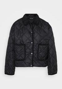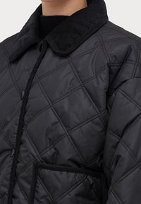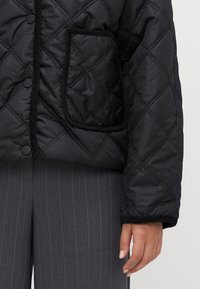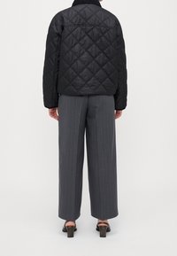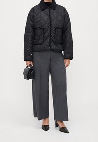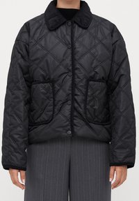 Veste matelassée noire avec col et bordure en velours côtelé, boutons-pression à l'avant et deux grandes poches avant, portée sur un pantalon à rayures fines.