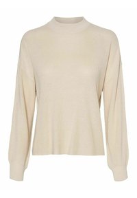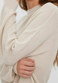 Femme portant un pull beige en maille à manches longues et un jean taille haute bleu, les mains jointes devant à hauteur de la taille.