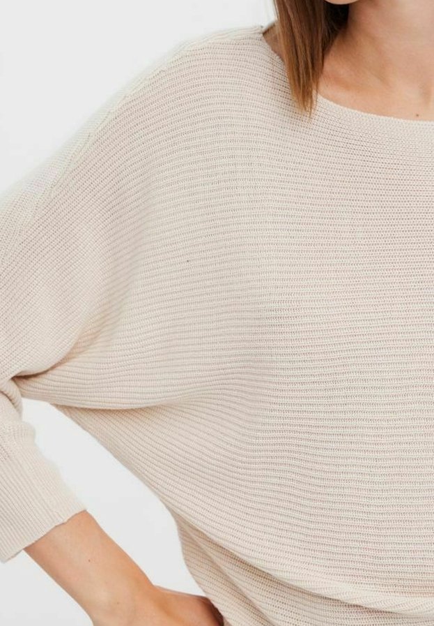 Femme portant un pull ample en maille côtelée de couleur crème avec des manches aux trois quarts, vue en gros plan du haut du corps et du bras.