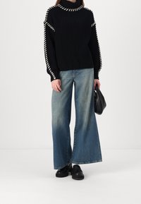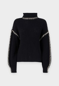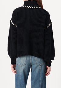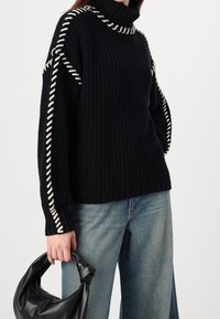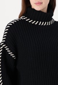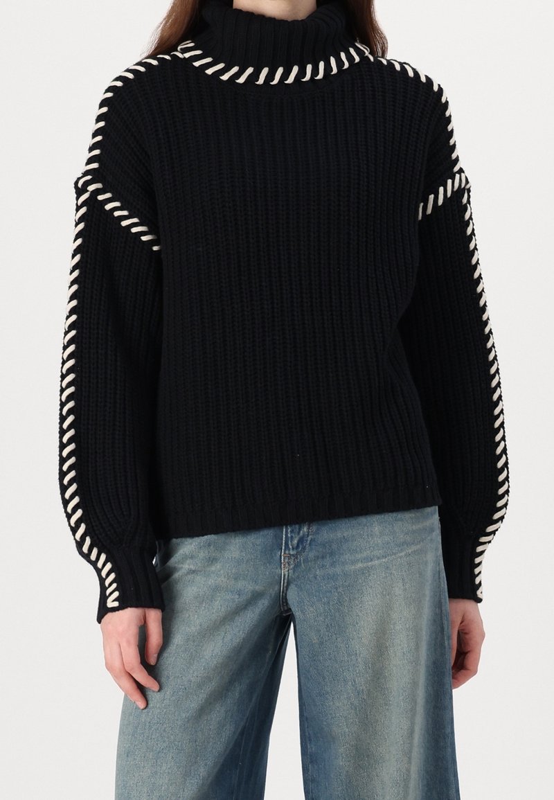 Femme portant un pull à col roulé noir côtelé avec des détails de coutures blanches sur les manches et les épaules, associé à un jean bleu clair.