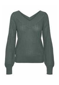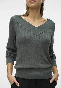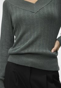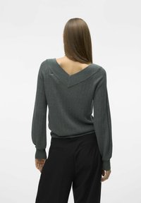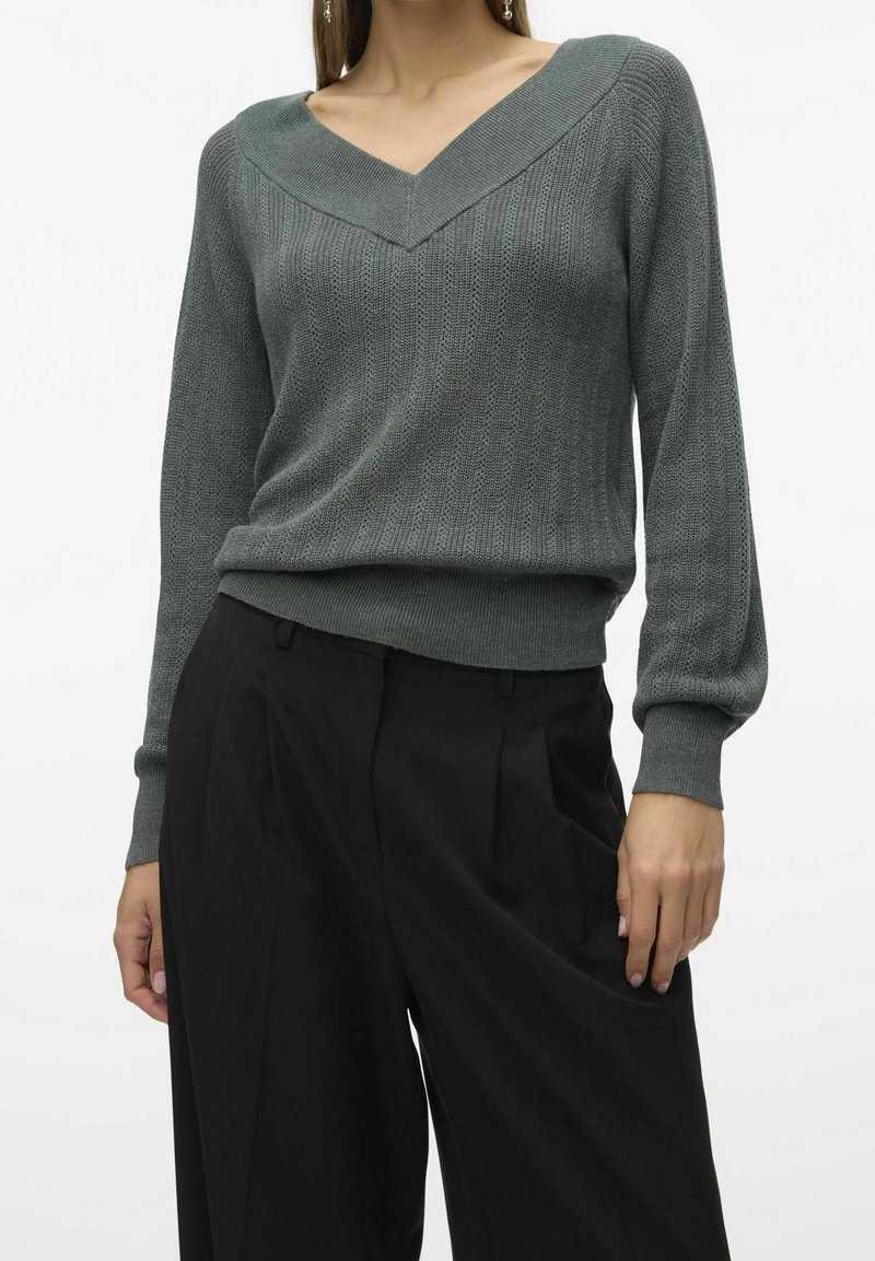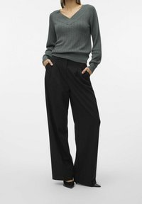 Femme portant un pull en maille gris à col en V avec manches longues et un pantalon noir taille haute à jambes larges.
