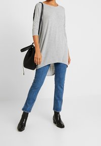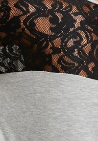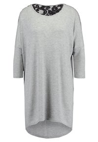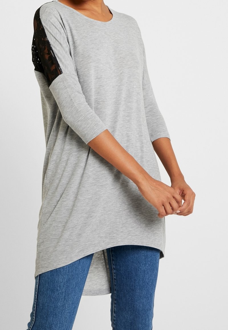 Femme portant une tunique grise avec des panneaux d'épaule en dentelle noire et des manches trois-quarts, associée à un jean bleu, les mains jointes devant.