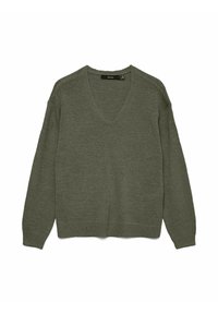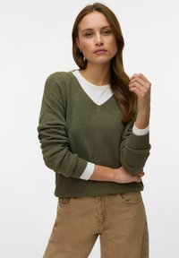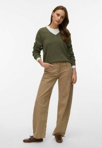 Femme aux longs cheveux bruns portant un pull col en V vert olive sur une chemise blanche, associée à un pantalon beige, posant avec un bras croisé.