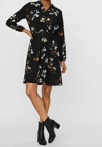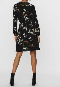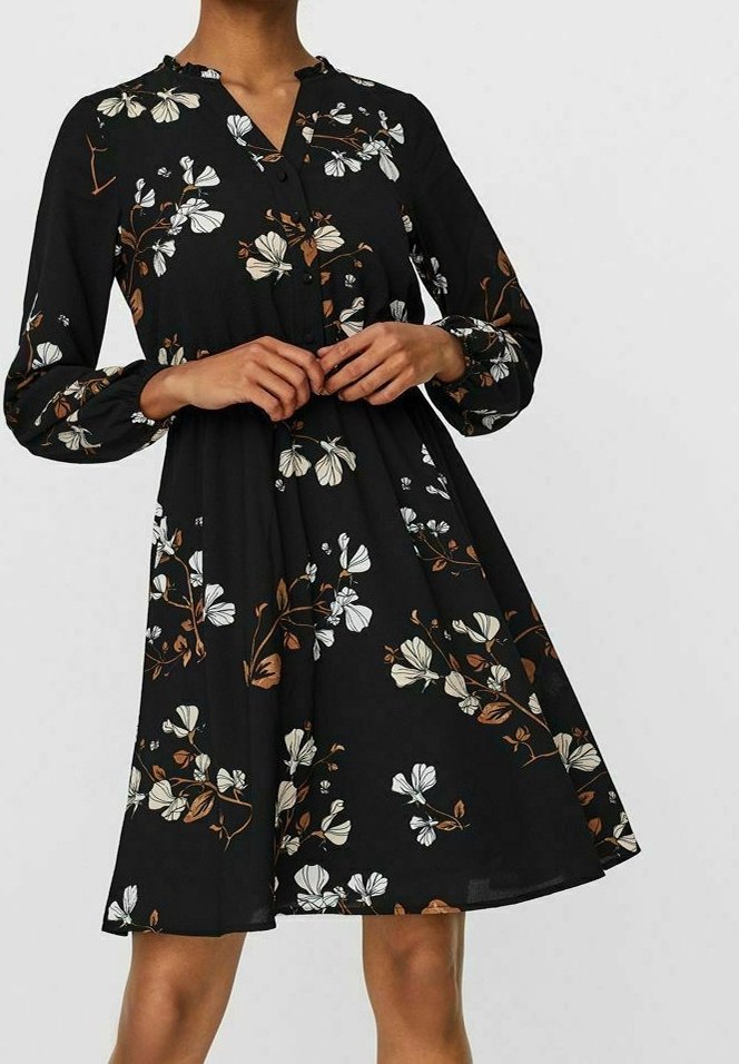 Robe noire à manches longues et plastron boutonné, ornée de motifs floraux en blanc et marron. Tissu léger et coupe décontractée.