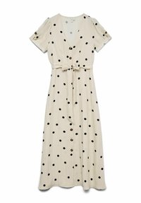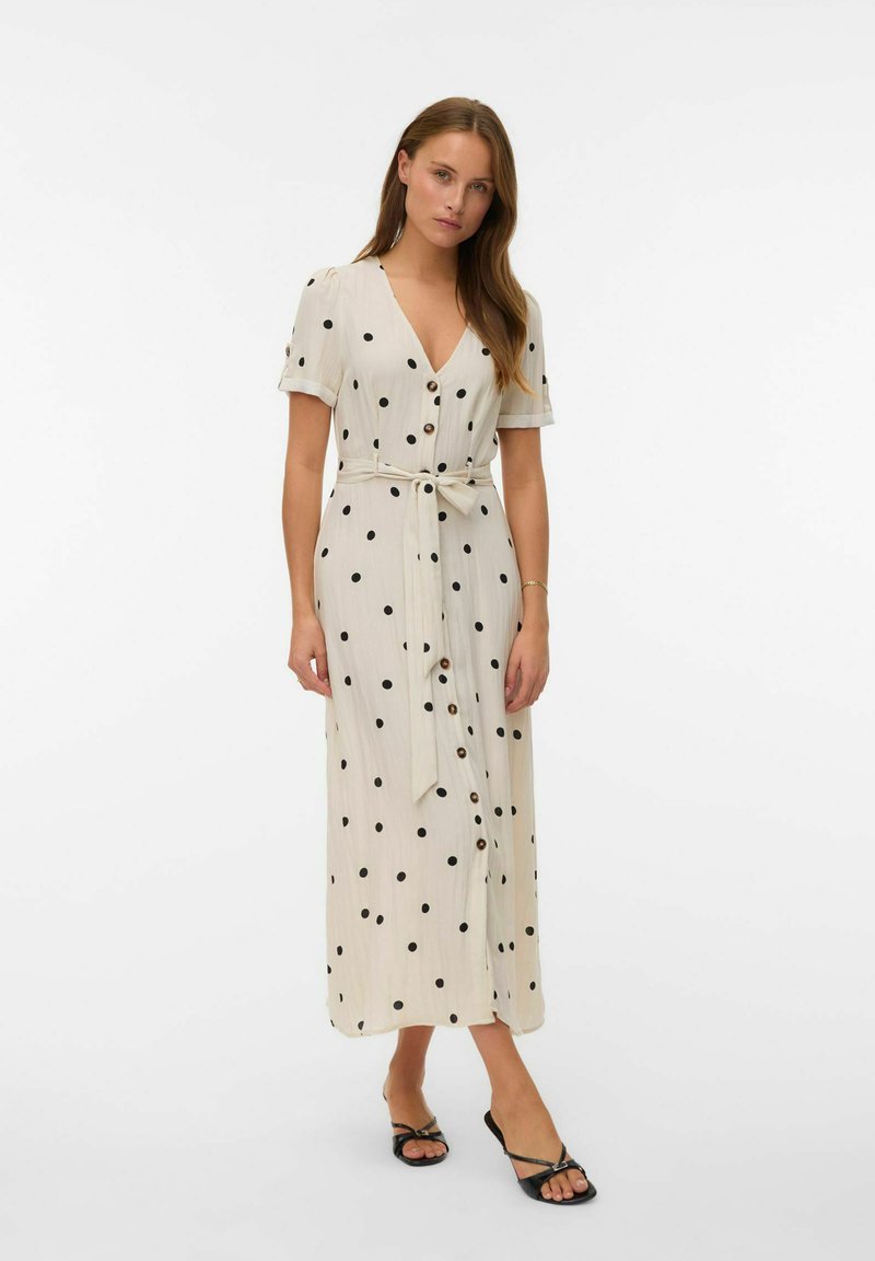 Femme portant une robe midi crème à pois noirs, avec boutons à l'avant, manches courtes et ceinture nouée à la taille, associée à des talons ouverts noirs.