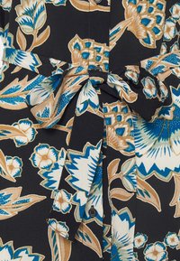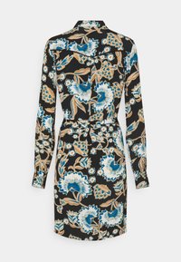 Robe chemise florale à manches longues, fond noir, fleurs bleues et beiges, col, et détail de taille nouée.