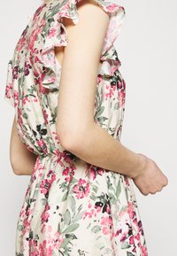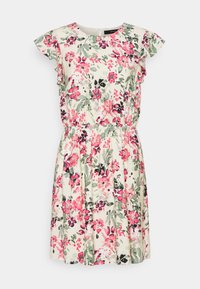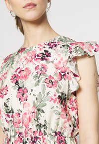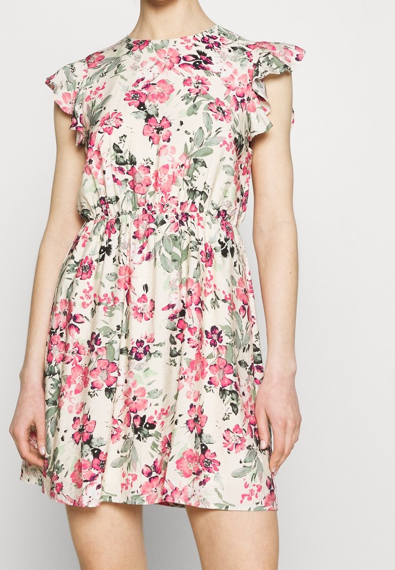 Robe fleurie en tissu léger, présentant un col rond, des manches courtes à volants, une taille élastique et un motif de fleurs roses et vertes.