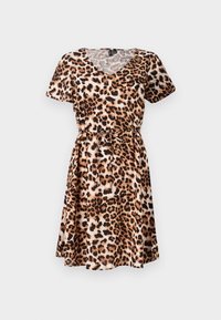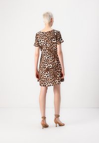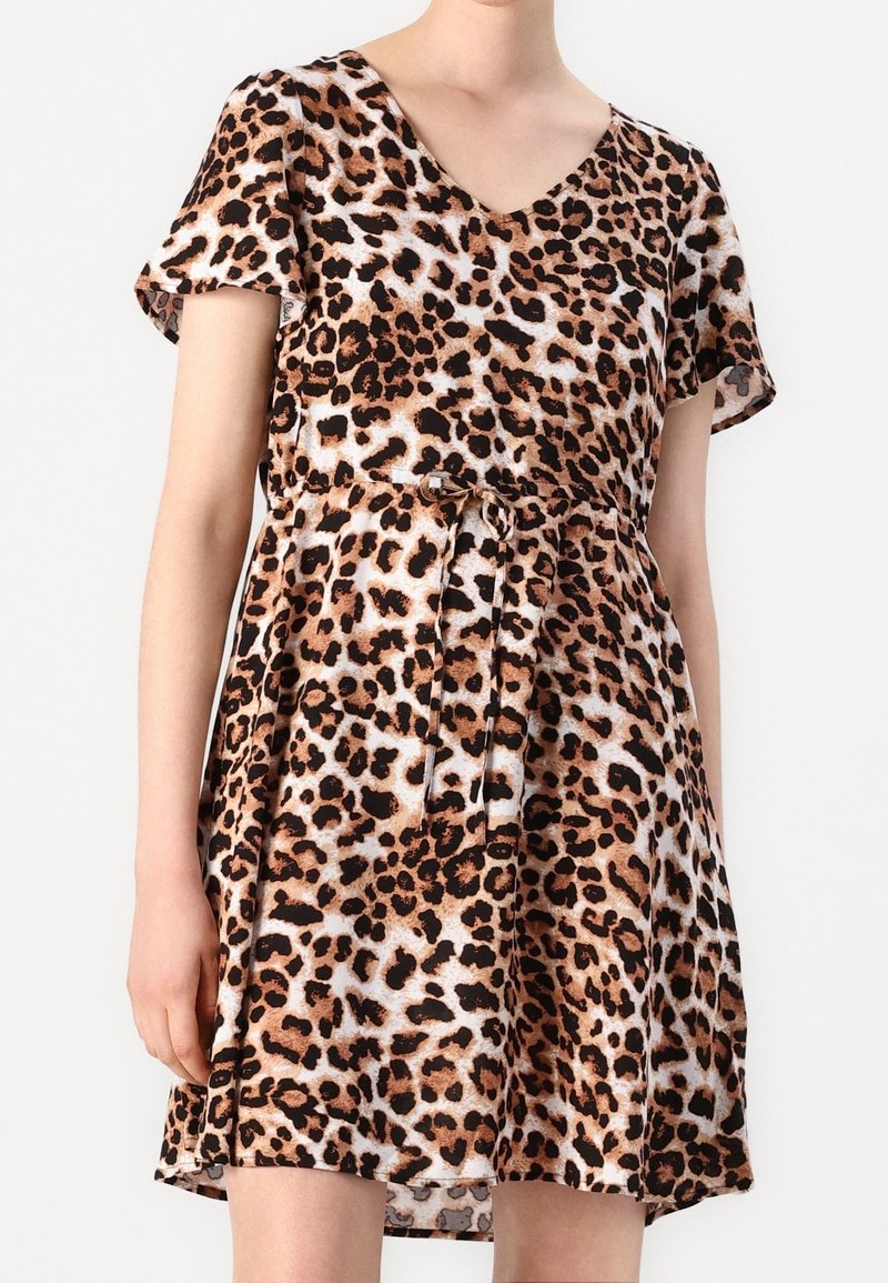 Robe à imprimé léopard avec manches courtes, col en V, taille élastique et détail à nouer. Fabriquée en tissu léger, avec des taches marron et noires.