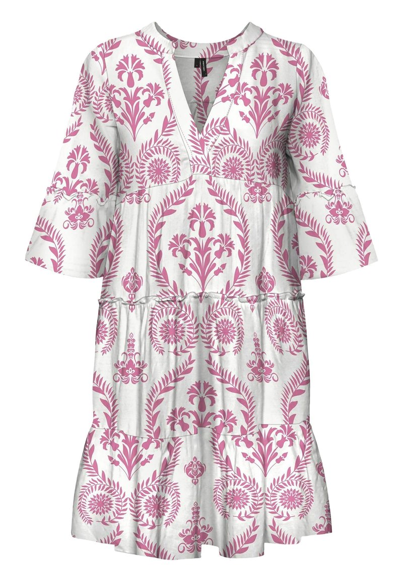 Robe blanche à motif floral rose, col en V, manches trois-quarts, ourlet à volants superposés, tissu léger, et détails complexes partout.