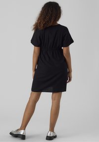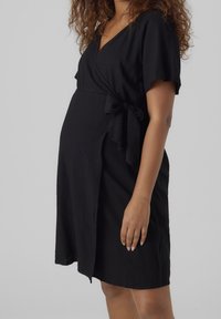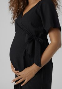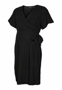 Robe noire enveloppante en tissu léger avec des manches courtes, un col en V, un détail de lien sur le côté et une coupe ample conçue pour le confort pendant la grossesse.