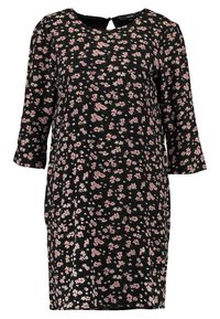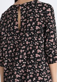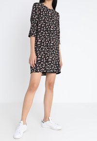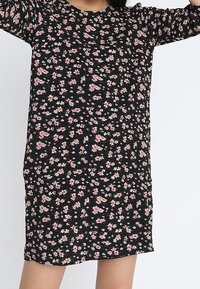 Robe noire à motif floral avec de petites fleurs roses et blanches. Manches courtes et coupe décontractée. Tissu doux avec un léger tombé.