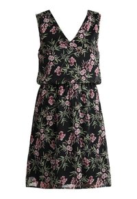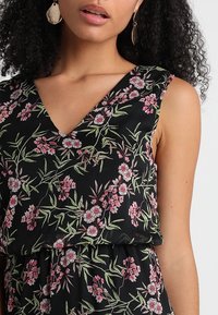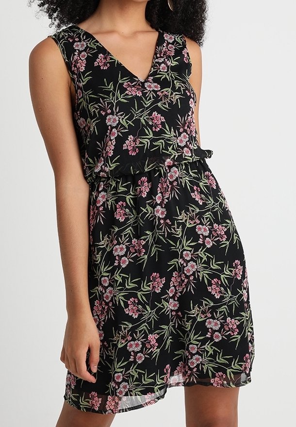 Robe noire à fleurs avec un décolleté en V, présentant un motif de fleurs roses et vertes. Fabriquée en tissu léger avec une taille élastiquée pour un ajustement décontracté.