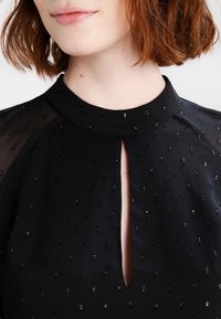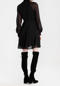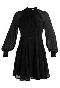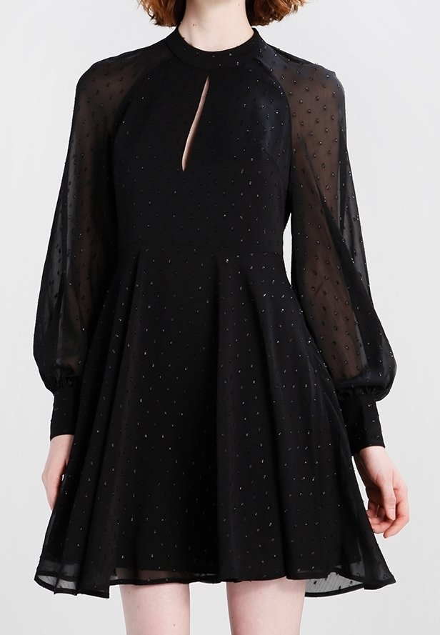 Robe noire avec des manches bouffantes transparentes, un col rond et un détail en forme de goutte. Présente une jupe évasée et une texture à pois sur l'ensemble.