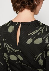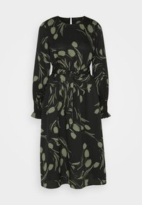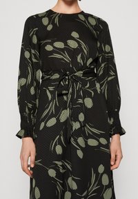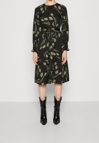 Robe noire avec motif floral vert, manches longues avec poignets volantés, taille cintrée avec lien, ourlet à mi-genoux, accompagnée de bottes de cowboy noires.