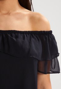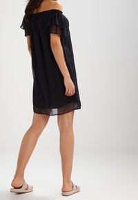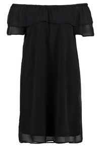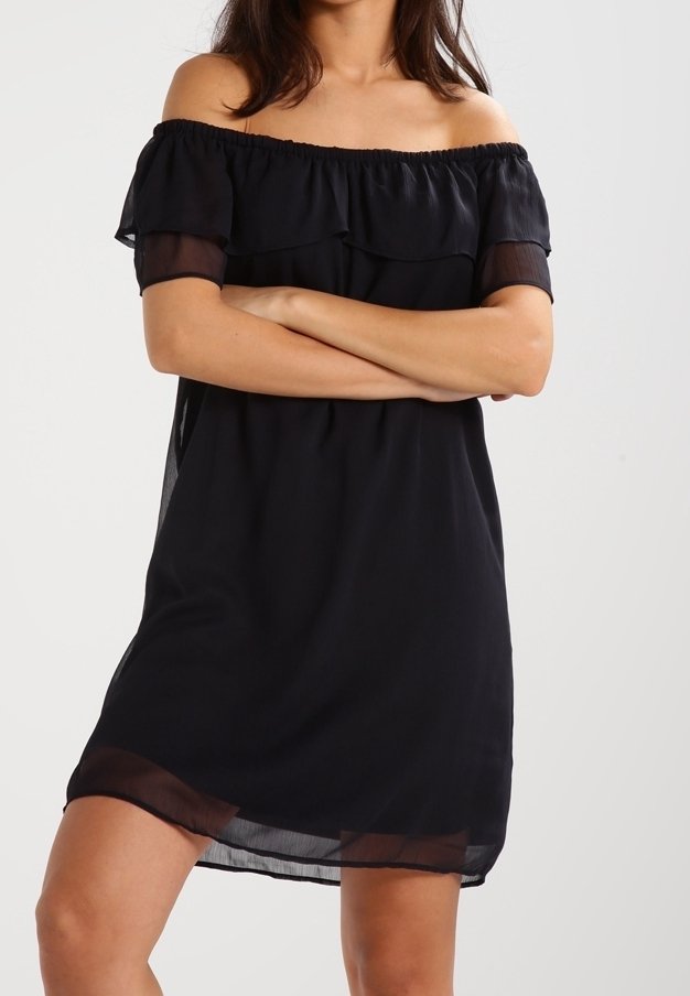 Robe noire décolletée avec des matériaux transparents, ornée de volants superposés le long de l'encolure et des manches, offrant une coupe ample et une longueur au genou.