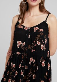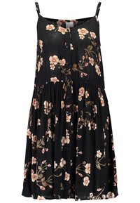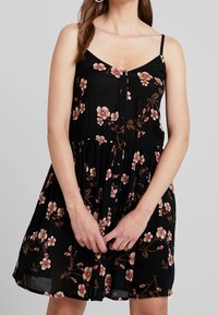 Femme portant une robe noire sans manches à boutons avec un imprimé floral rose et marron, les mains doucement croisées devant, fond neutre.