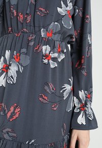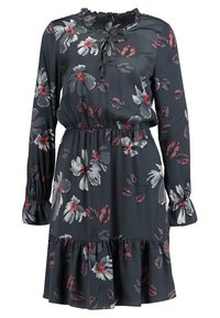 Robe fleurie en tissu bleu marine avec des motifs de fleurs rouges et blanches. Comprend des manches longues, un ourlet à volants et un col à nouer.
