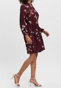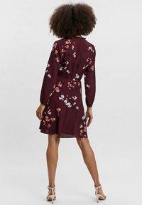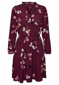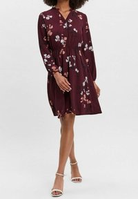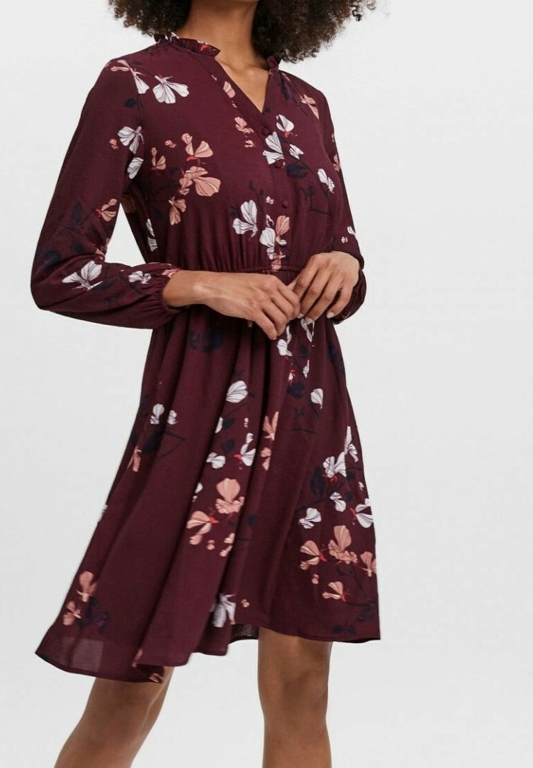 Robe bordeaux avec un motif floral rose et blanc. Encolure en V, manches longues et taille cintrée. Jupe fluide avec une légère texture.