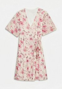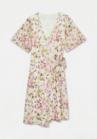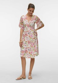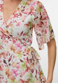 Femme ajustant le décolleté d'une robe portefeuille fleurie mi-longue avec des fleurs roses, orange et vertes sur fond blanc.