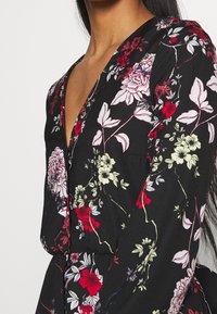 Robe noire à fleurs avec manches longues, encolure en V et taille cintrée. Elle présente des motifs floraux colorés en rouge, rose et vert.