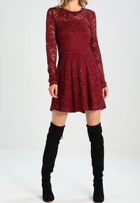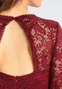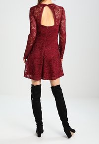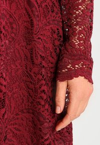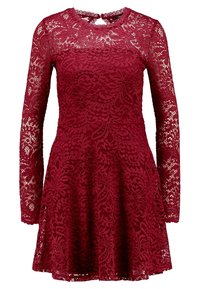 Femme portant une robe en dentelle bordeaux à manches, longueur genou, avec des motifs floraux et une taille cintrée.
