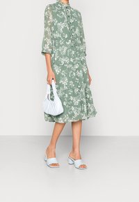 Personne portant une robe midi verte à imprimé floral blanc, avec un devant boutonné, une ceinture nouée, des manches trois-quarts, et des sandales à talon bloc bleu clair à bout ouvert.