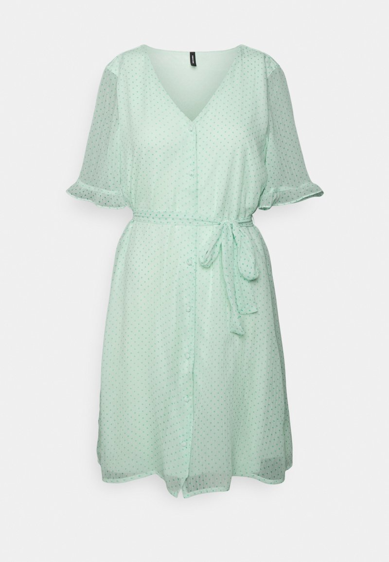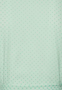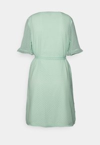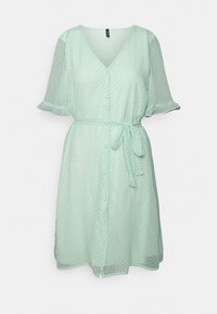 Robe vert clair jusqu'aux genoux avec un petit motif à pois, col en V, manches courtes à volants, boutons à l'avant et ceinture nouée à la taille.
