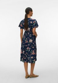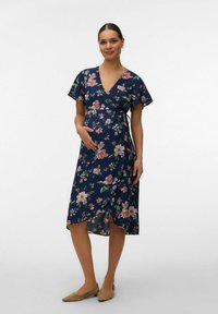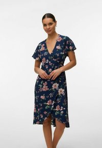 Femme aux cheveux foncés portant une robe portefeuille bleu marine à motifs floraux avec de courtes manches volantées, debout devant un fond blanc uni.