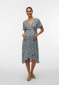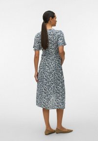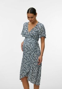 Femme portant une robe portefeuille mi-longue à fleurs bleu marine et blanche avec des manches courtes évasées, debout devant un fond blanc uni.