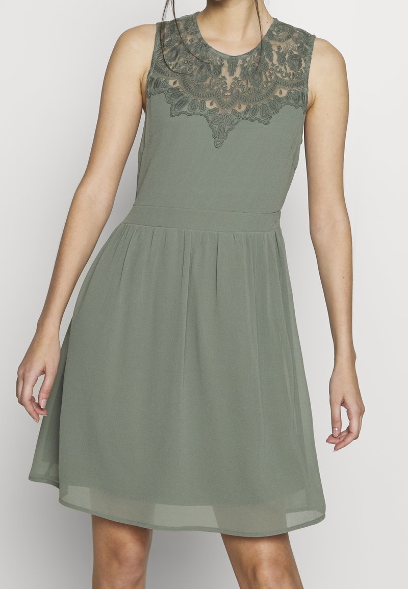 Robe verte avec un corsage en dentelle transparente et une jupe évasée. Fabriquée en tissu léger avec une texture lisse et une forme A légèrement marquée.