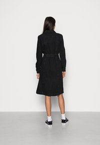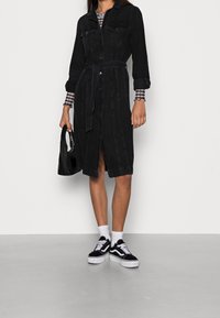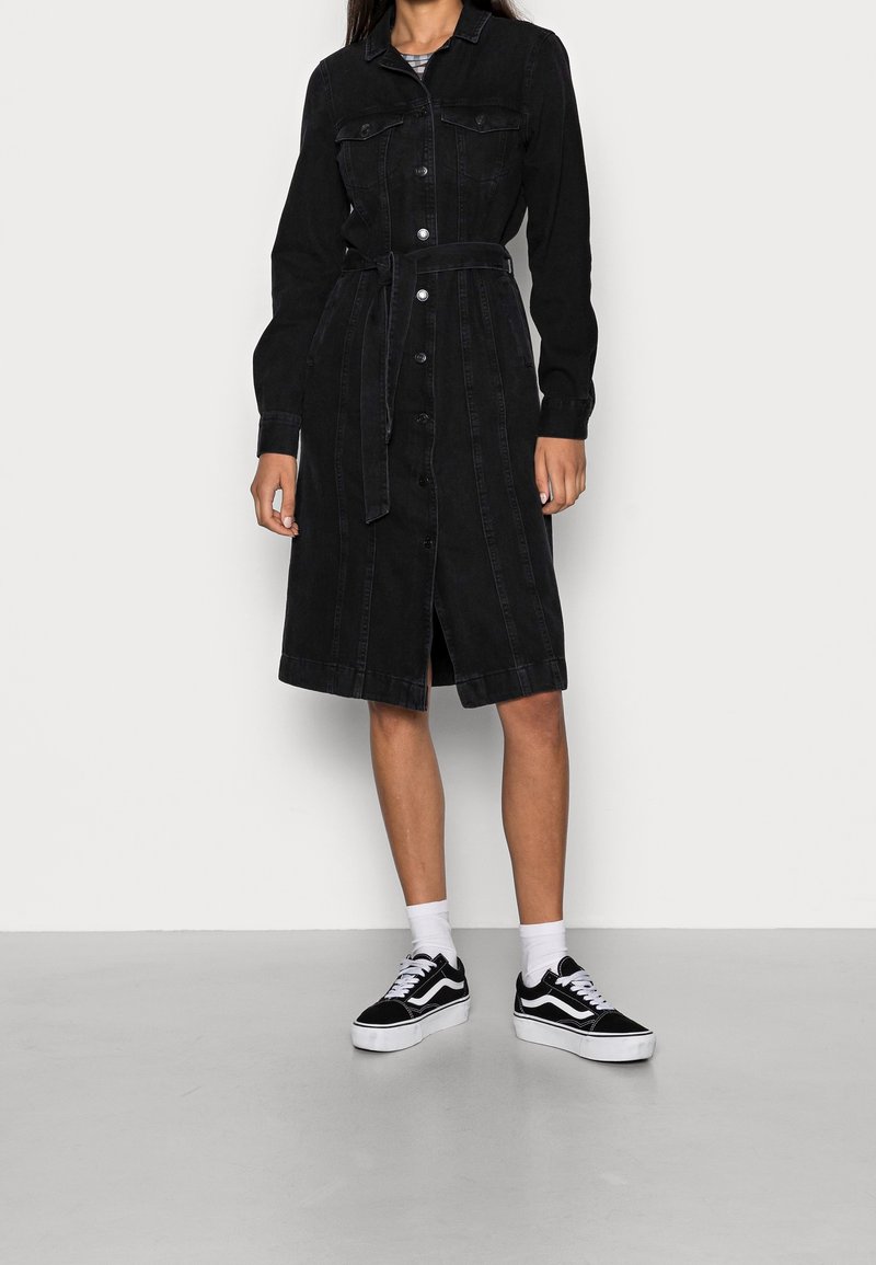 Robe chemise en denim noir avec des manches longues, un boutonnage à l'avant et une taille ceinturée. Comprend des poches poitrine et une longueur en dessous du genou. Associée à des baskets noires.