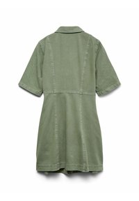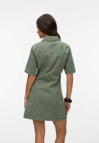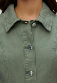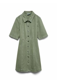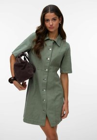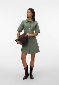 Femme portant une robe boutonnée manches courtes de couleur vert olive, tenant un sac à main marron foncé, avec de longs cheveux ondulés et une expression neutre.