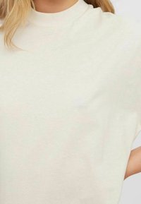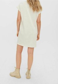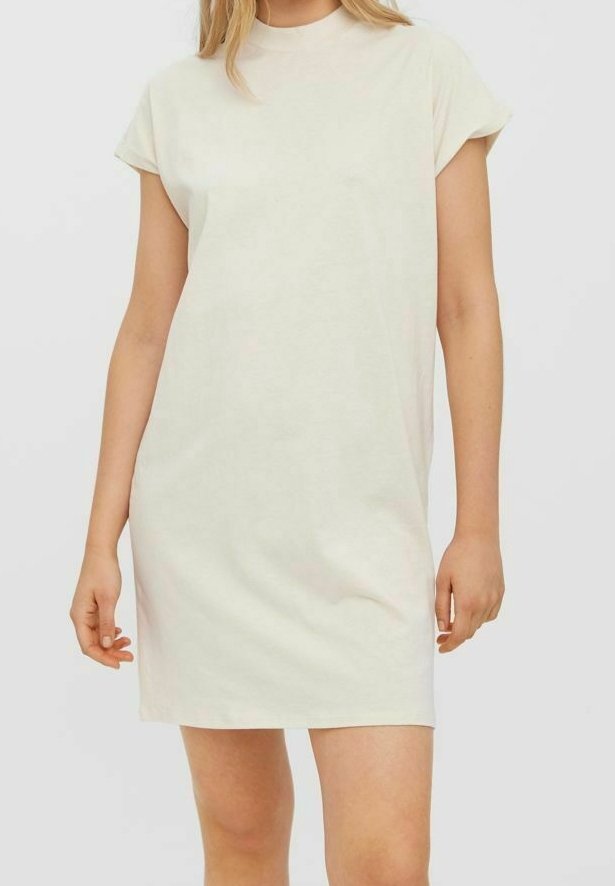 Robe en coton beige clair à manches courtes avec un col rond, offrant une coupe décontractée et une texture lisse. Design minimaliste sans motifs.