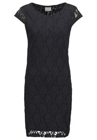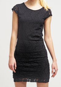 Femme portant une robe en dentelle noire ajustée avec des manches courtes, un motif floral et un col rond, se tenant devant un fond uni.
