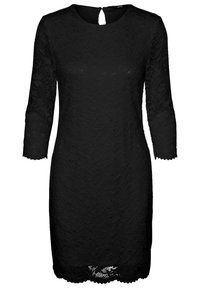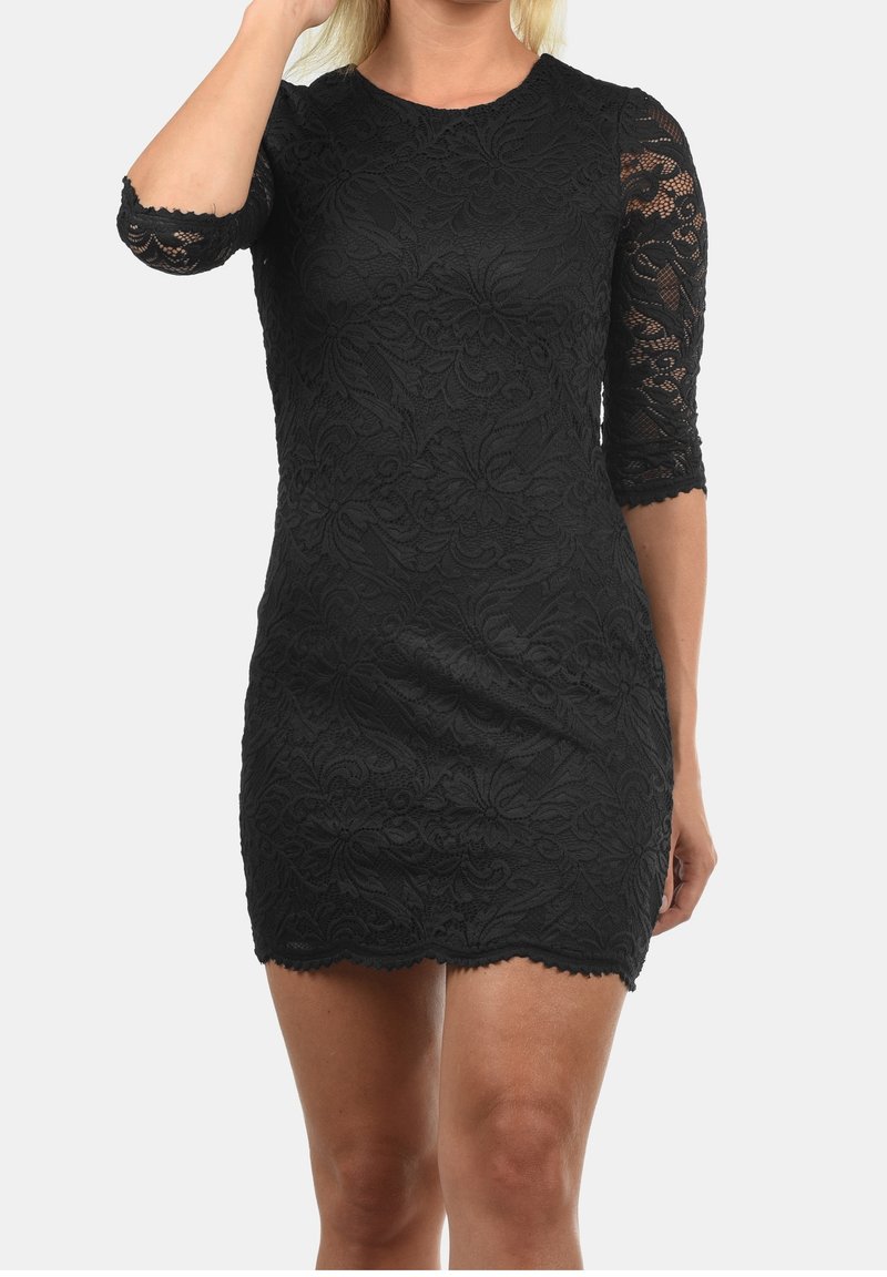 Robe en dentelle noire avec manches trois-quarts, motif floral et ourlet festonné. Coupe ajustée avec tissu texturé.