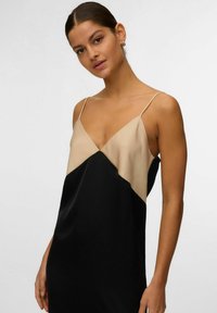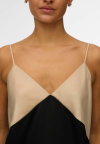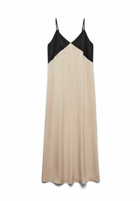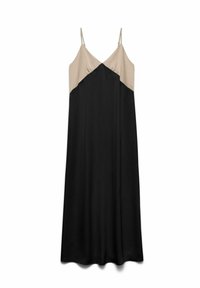 Femme debout portant une robe longue noire et beige sans manches avec des bretelles fines et des sandales noires à bouts ouverts sur un fond clair uni.