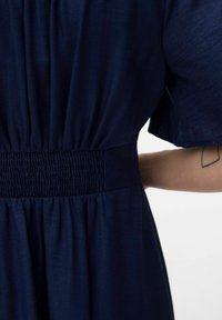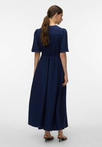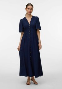 Femme portant une longue robe chemise bleu marine à manches courtes volantées et des sandales à talons ouvertes sur un fond blanc uni.