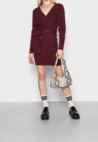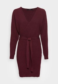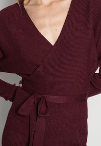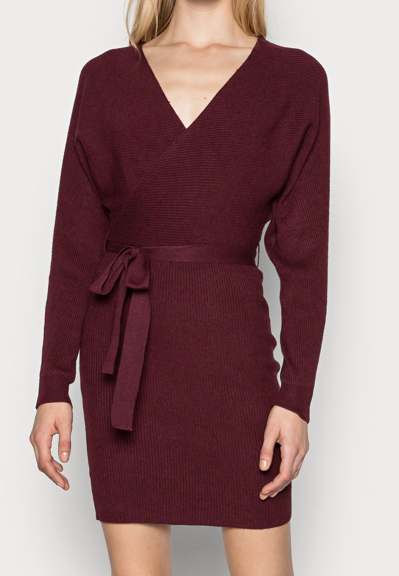 Robe portefeuille en tricot côtelé bordeaux avec manches longues, encolure en V et ceinture assortie à nouer à la taille. Texture douce et coupe ajustée.