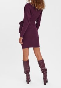 Robe en tricot violet avec des manches longues, un col rond et une coupe ample, assortie à des bottes en cuir marron jusqu'aux genoux avec des pointes.
