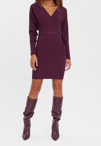 Robe tricotée bordeaux avec des manches longues, des épaules dénudées et une jupe évasée. Portée avec des bottines noires brillantes.