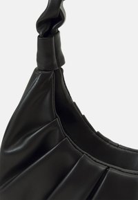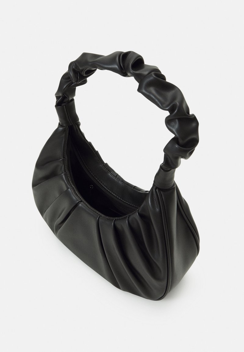 Sac à main en cuir noir avec une anse froncée et des détails plissés, présenté ouvert avec une poche intérieure zippée visible.