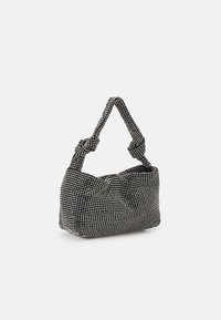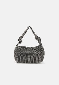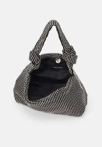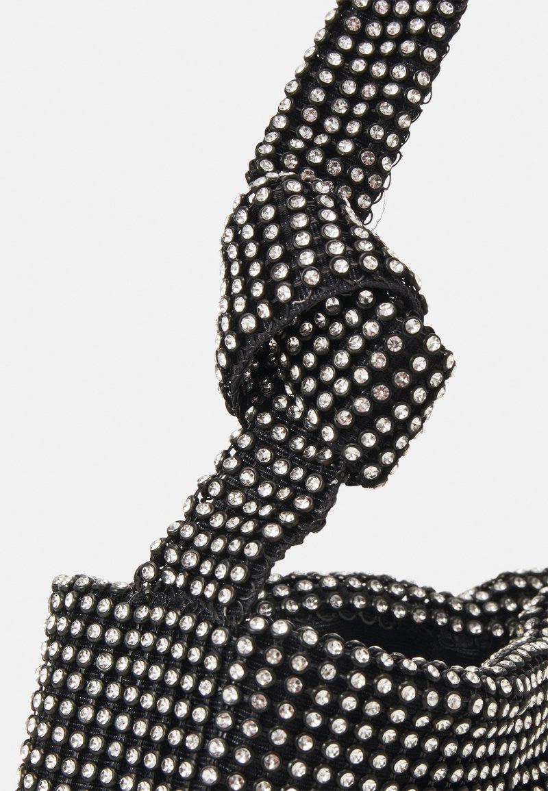 Anse et bord de sac à main en tissu noir ornés de petits strass ronds transparents serrés, avec un détail noué sur l'anse.